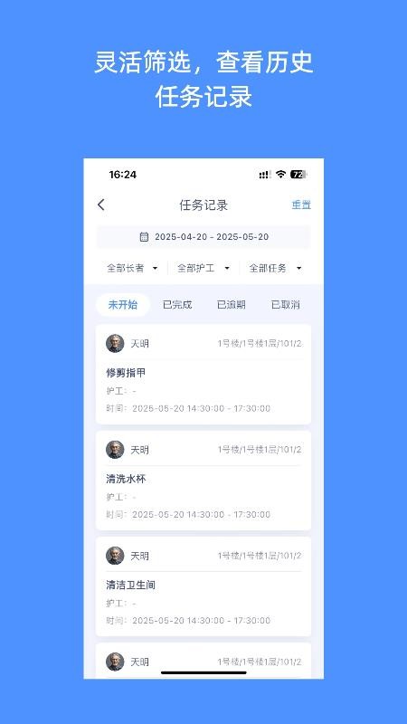 创建任务时可设置依赖关系链,支持扫码添加物资清单。任务卡片内置检查项模板库,完成质量评估结果将影响护工绩效考核评分,形成管理闭环。