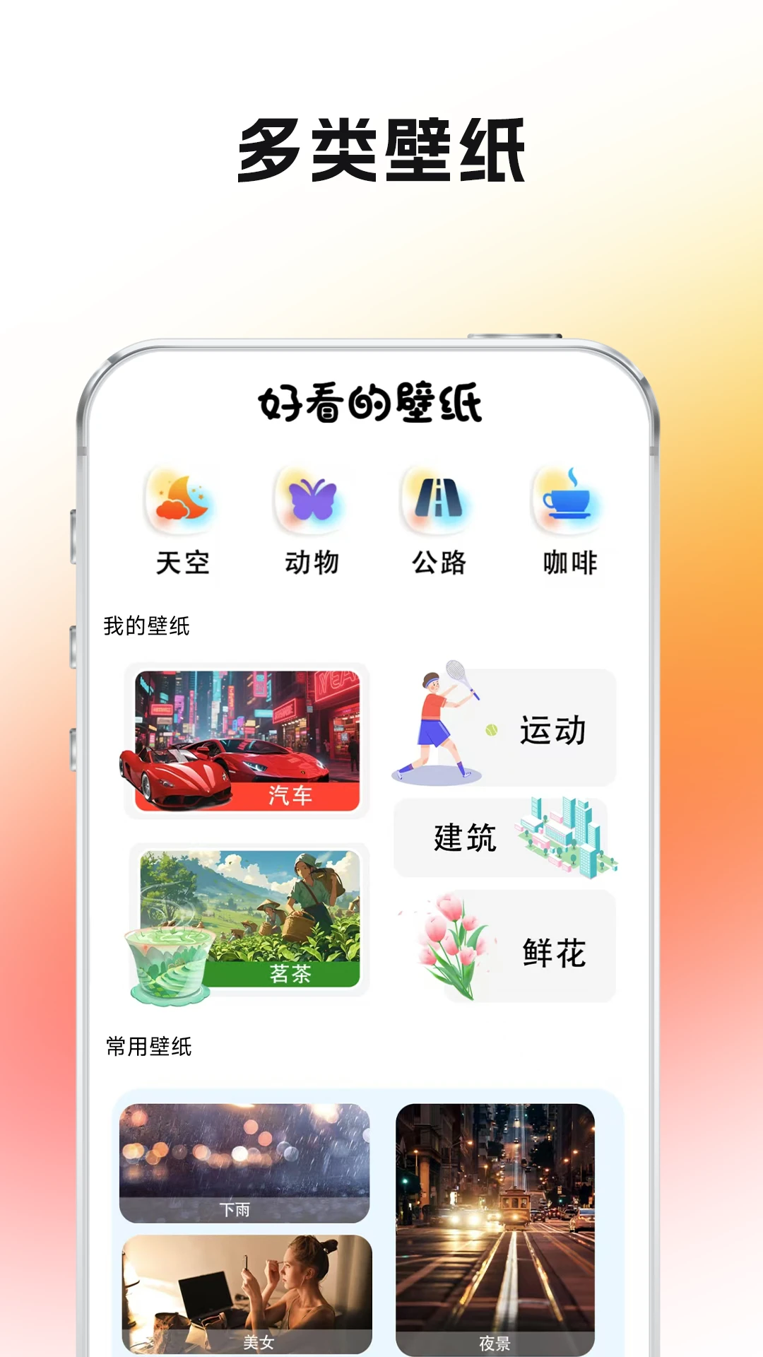 以海量丰富的壁纸资源、强大便捷的功能,致力于成为每位用户装点手机桌面的得力助手,让你的手机屏幕时刻绽放独特魅力。丰富分类体系:APP内的壁纸资源涵盖了五花八门的类别,无论你钟情于清新自然的唯美风景,还是渴望在手机上随时领略山川湖海的壮丽,都能在对应的分类中找到心仪之选。高清画质呈现:所有壁纸均提供高清1080P及以上分辨率,确保在不同品牌、型号的手机屏幕上显示时,都能清晰细腻,色彩鲜艳,细节分毫毕现。即使将壁纸放大查看,也不会出现模糊、失真的情况,为用户带来极致的视觉享受。持续更新内容:紧跟当下流行趋势与热点话题,APP会定期更新壁纸库,不断为用户输送壁纸资源。让你的手机壁纸始终走在时尚前沿,永不out。