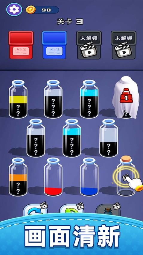 游戏采用独特的色彩分层显示技术,不同颜色的液体会在瓶中形成清晰的分层效果,这不仅让视觉效果更加美观,还能帮助玩家更直观地判断操作顺序。