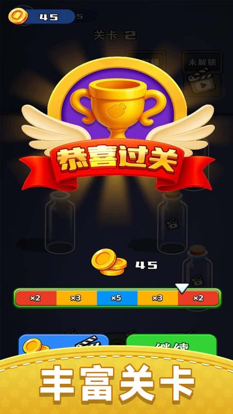游戏中的瓶子设计各具特色,有的容量大适合储存,有的开口小需要精准操作。玩家需要根据不同的瓶子特性来调整策略,比如优先处理难以移动的液体,或是利用空瓶作为中转站。游戏还设置了成就系统,记录玩家在闯关过程中的各项表现。
