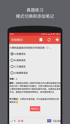 真题练习,真题试卷,全面解析,刷题更效率,支持答题模式和学习模式切换,添加学习笔记,操作真题步骤,支持重置做题,刷题统计;