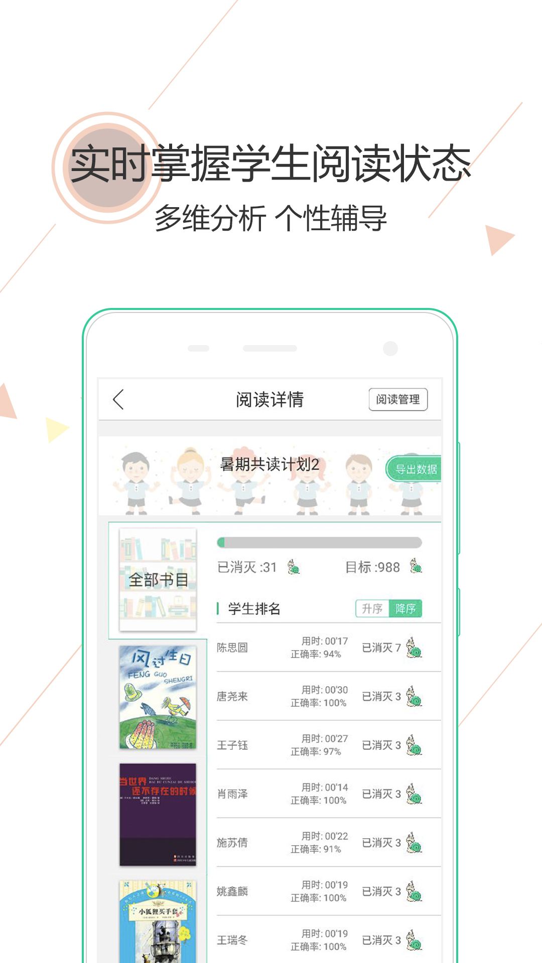 您还可以利用阅伴制定全校性的共读计划,并进行数据化管理。系统提供多维度的数据分析功能,比如定期查看班级阅读排行榜,及时发现教学亮点或问题,为教学决策提供依据。