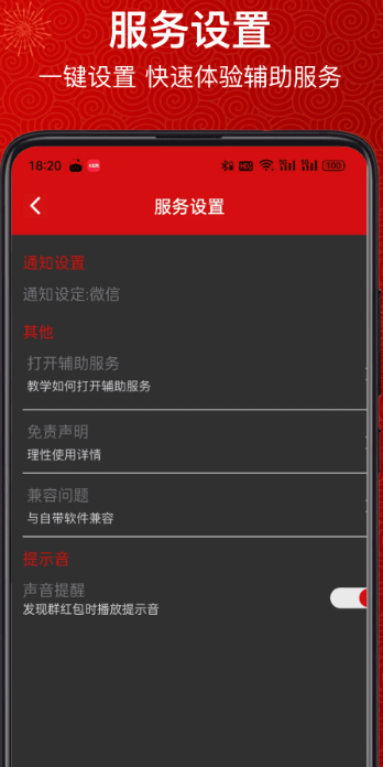 支持多种提醒方式设置,包括语音播报、震动提醒等,用户可根据不同场景自由组合。语音提醒支持自定义内容录制,让抢红包更有趣味性。