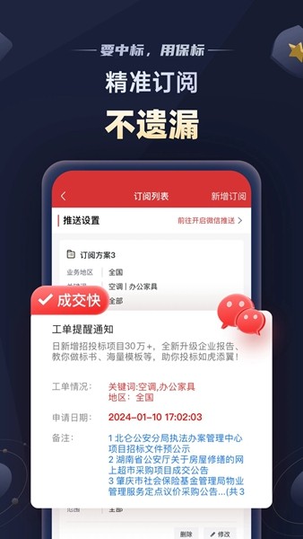通过订阅功能设置关键词和地区,系统将自动推送相关招标信息。