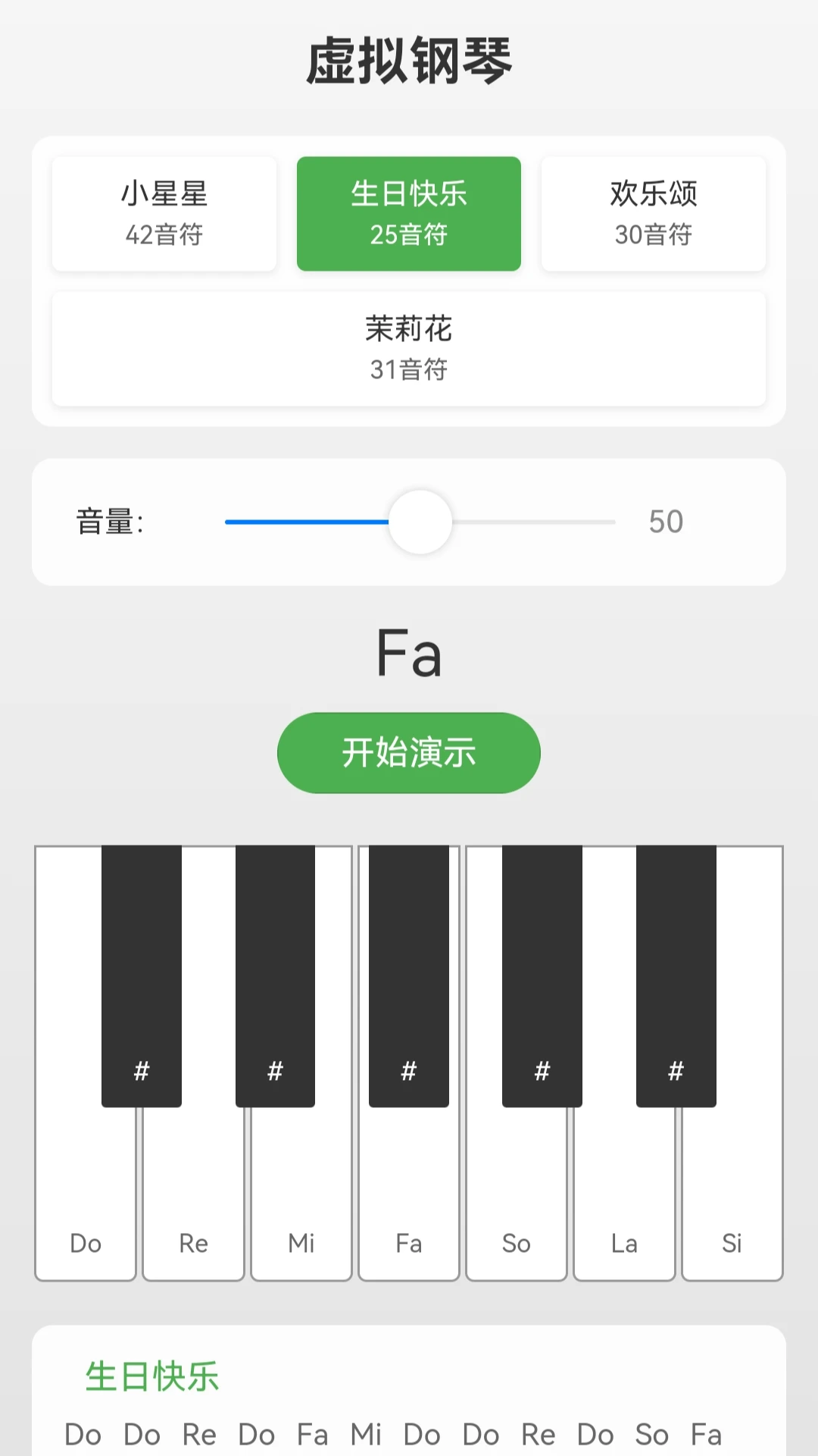 设有虚拟钢琴功能,提供《小星星》《生日快乐》《欢乐颂》《茉莉花》等曲目,显示音符数量。可调节音量,点击琴键或选择曲目“开始演示”,轻松体验音乐创作与演奏的乐趣。