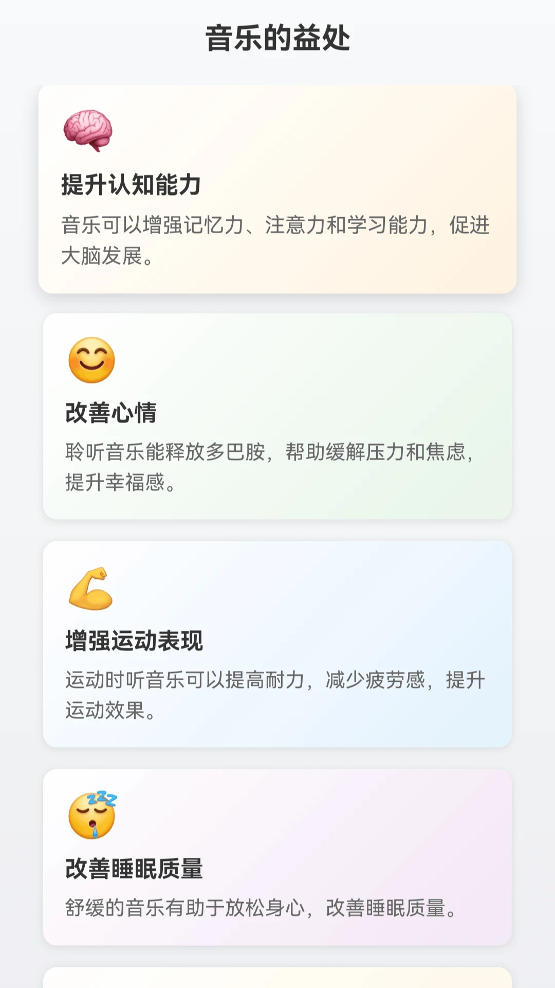 音乐科普模块包含20+专业研究文献解读,以动画形式呈现科学结论