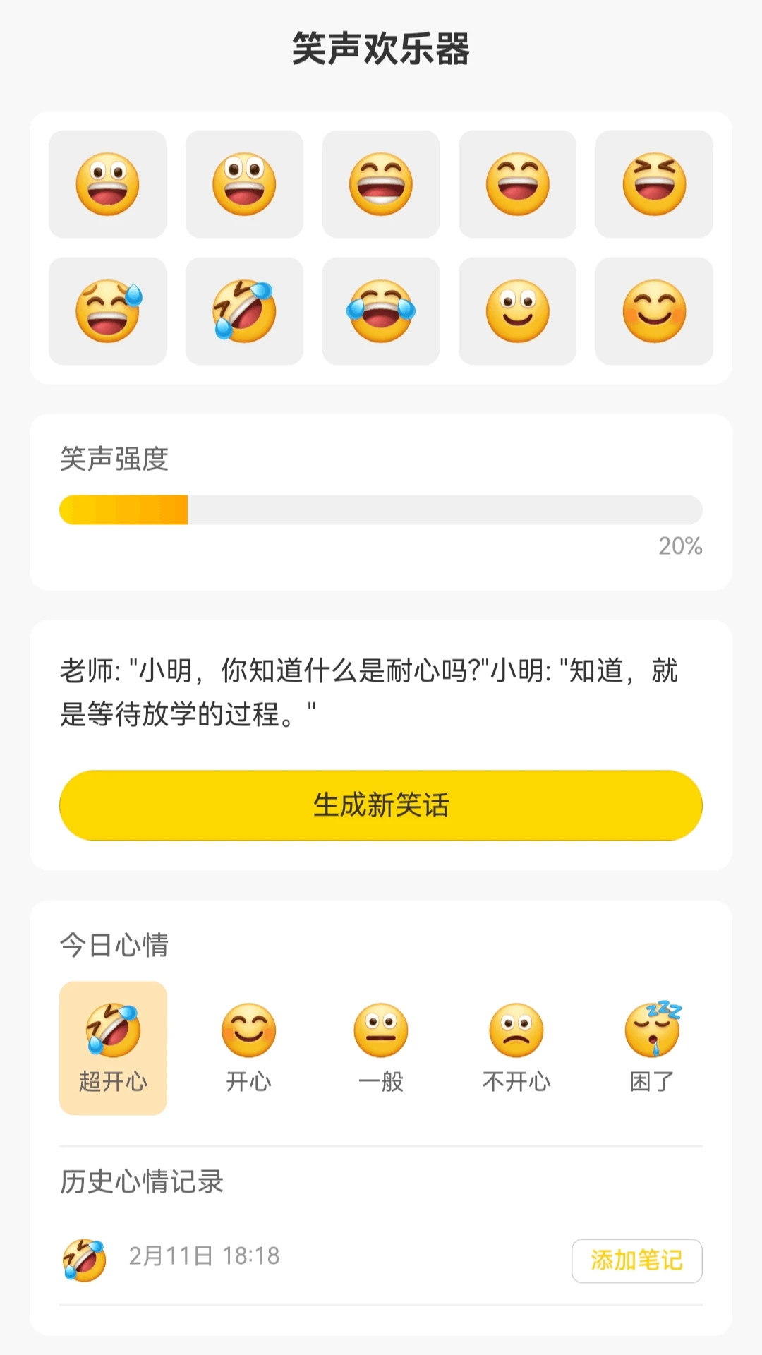 提供多种表情符号代表的笑声,可调节笑声强度。还有海量笑话,点击“生成新笑话”随时收获欢乐。同时能记录每日心情并添加笔记,帮您留存情绪点滴。