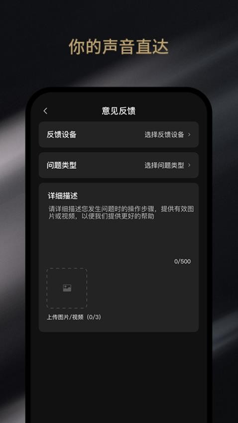 还可以对自己的意见来实时反馈,随时提交自己的建议。反馈界面设计简洁明了,支持文字、图片、视频等多种形式,确保用户能够完整表达遇到的问题。