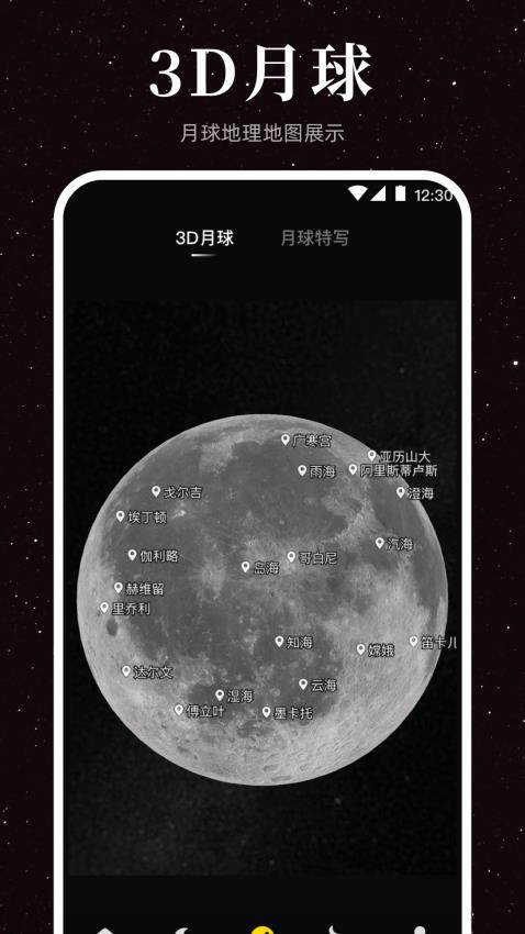 提供交互式月球地图,标注了主要环形山、月海、山脉等地理特征。支持缩放和旋转查看,用户可以自由探索月球表面,了解各个区域的命名和地质特点。