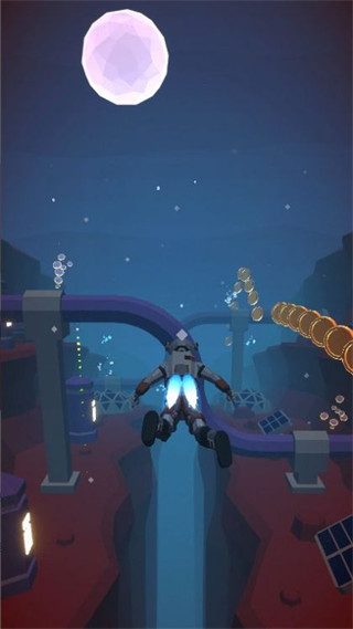游戏采用直观的触控操作方式,只需轻点屏幕两侧即可精准控制喷气背包的飞行方向与力度,操作简单易上手但又不失深度。完成主线任务和支线挑战可以解锁超过50种特殊装备和功能模块,包括隐身模式、超级加速、地形扫描等,大大丰富了游戏的可玩性。
