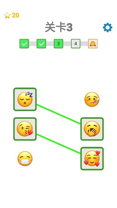 基础连线规则简单易懂:玩家只需滑动手指连接两个相同表情,但需要注意路径不能交叉或重复使用,同时还要在规定的步数内清空棋盘上所有表情元素,这种看似简单实则充满策略性的玩法让人欲罢不能。