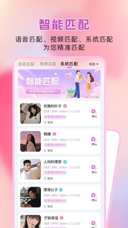 智能算法筛选高质量用户,提升匹配精准度。24小时在线客服随时解决交流问题,确保沟通无障碍。系统还会根据用户反馈不断优化匹配策略,提高缘分质量。