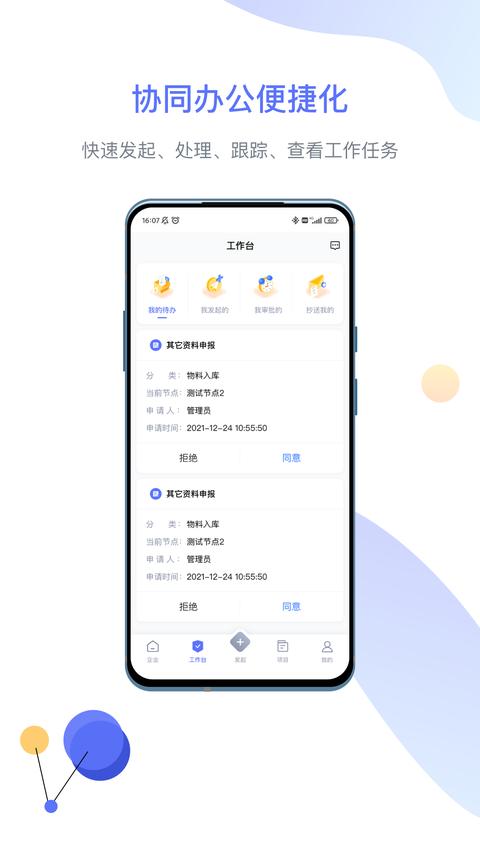 ・提供便捷的审批工作处理功能,用户可以快速发起各类业务流程