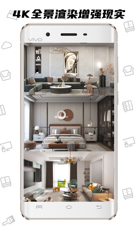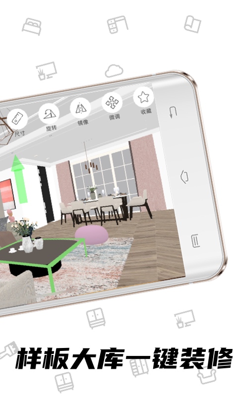 App内置的【一键装修】功能非常智能,可以在房间内自动摆放好家居软装和硬装效果,省去了繁琐的布局调整过程。【装修效果图】功能支持极速三维摆放和快速高清渲染,还能自由绘制真实房型尺寸,让设计更加精准。