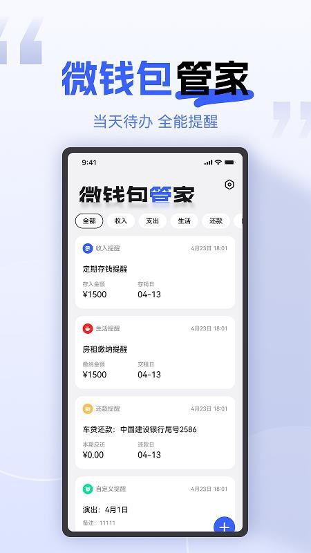 微钱包管家app主要为用户提供了提醒助手,这里可以对用户的钱包来实时提醒,各种收入记账、还款、日程等都可实时提醒,准时提醒用户,就可让你便捷的掌握,更好的获取准时提醒,进而可以快捷出行,随时查看待办倒计时,让你便捷的设置。