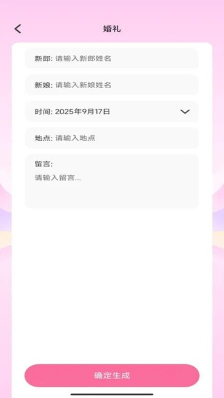 然后就可以输入婚礼喜帖的详细信息,包括新人姓名、婚礼时间地点等,点击"确定生成"功能按键进行下一步。