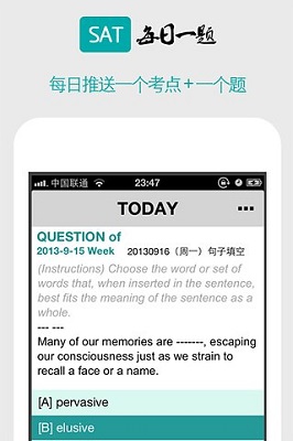 SAT每日一题——培养您的SAT学习习惯!这款创新应用是一个开放式的学习平台,汇集了来自知名教育专家和SAT高分学员的优质题目资源与专业解析。不同于传统的简单题目+答案模式,我们每天为您精心准备SAT填空、语法、数学等各类题型,每道题目都配有详细的解题思路和知识点拓展。通过日积月累的练习,您将建立起完整的知识体系,稳步提升SAT应试能力。