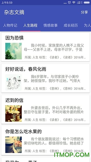 杂志是一款专注于心灵成长与情感共鸣的优质文章聚合平台,精选国内外知名文摘、杂志及网络平台的深度美文。应用采用清新简约的设计风格,每日推送温暖人心的励志故事、人生感悟和智慧箴言,帮助用户在繁忙生活中找到心灵慰藉。平台内容经过专业编辑团队严格筛选,确保每篇文章都能带来启发与思考,是追求精神成长的现代人不可或缺的阅读伴侣。