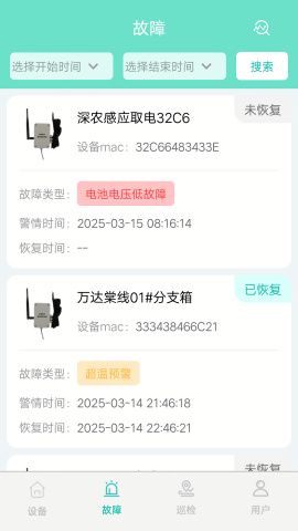 故障查询功能支持按时间范围筛选故障记录,帮助用户快速定位历史故障,分析故障规律。在线巡检模式彻底改变了传统的人工巡检方式,用户只需通过手机就能完成设备巡检工作,大幅提升工作效率。数据统计模块会自动汇总设备数量、预警数据和故障数据等关键指标,生成直观的统计图表,为管理决策提供数据支持。