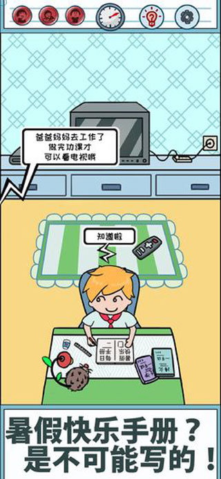 总的来说,暑假是不可能写作业的是一款充满创意和趣味的休闲益智游戏,它不仅能让玩家重温学生时代的记忆,还能在轻松愉快的氛围中锻炼思维能力。无论你是想体验逃避作业的"叛逆感",还是单纯享受解谜的乐趣,这款游戏都能满足你的需求。