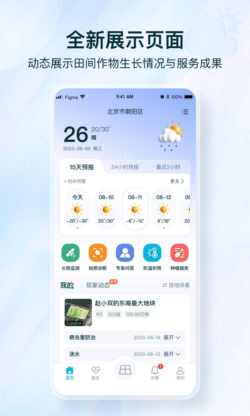 天气信息服务提供2小时内的动态降水云图和24小时天气预报,同时支持15天的中长期气象预测,帮助用户提前做好农事安排和灾害防范。