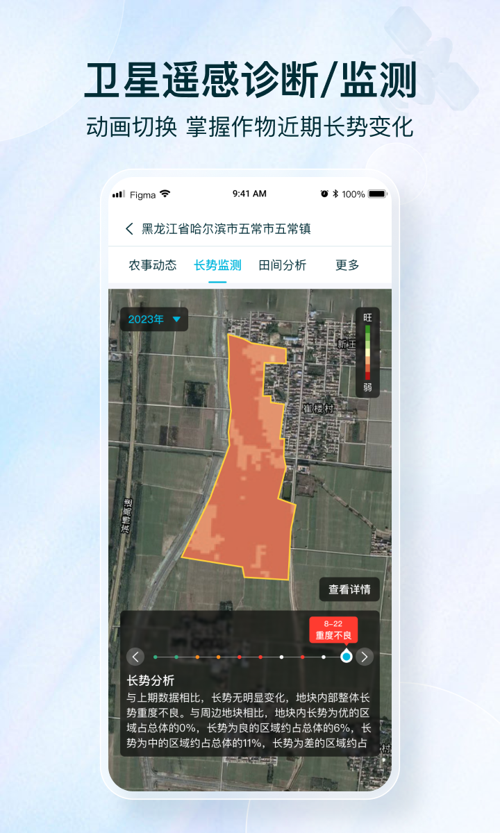 卫星遥感监测系统每5-7天更新一次:通过高分辨率卫星影像,实现科学、高效、低成本的田间巡查管理,快速识别长势异常区域,让种植者足不出户就能掌握大田整体状况。