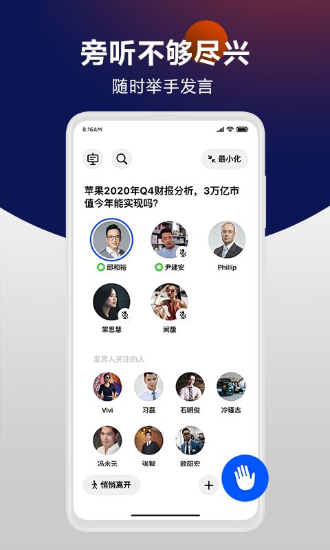 这是一个面向行业精英的语音社交平台,在「举手」您可以参与各行大咖的专业分享会,还能通过"举手"功能随时加入讨论。平台支持创建个性化话题房间,您可以邀请好友或开放给其他感兴趣的用户,共同交流行业见解。独特的语音互动机制让您随时举手发言,与多人在线即时互动,结识不同领域的专业人士。平台还提供行业认证功能,确保用户身份的真实性,让社交更有质量。
