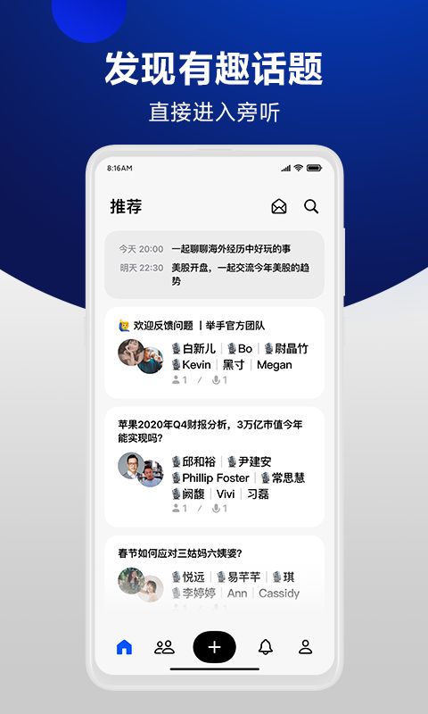 下载安装软件后打开,进入平台可以看到丰富的话题分类和热门讨论。平台采用简洁直观的界面设计,新用户也能快速上手。选择不同的话题进行聊天探讨,每个话题房间都有专业主持人引导讨论,互动内容精彩纷呈。用户可以根据个人兴趣筛选话题,系统也会根据您的职业背景智能推荐相关讨论组。