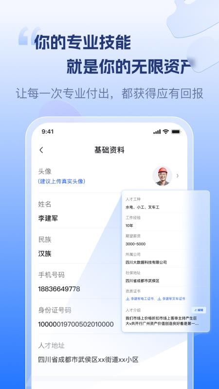 支持个性化资料设置,用户可以完善专业技能、工作经历等信息,提高个人展示效果,增加接单成功率。