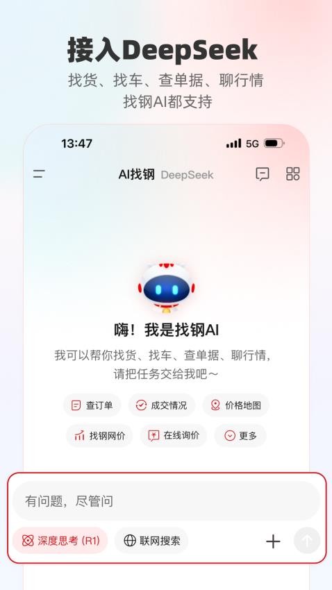 深度整合AI技术,新增智能找货、物流匹配、单据查询等功能,全新设计的用户界面更加简洁直观