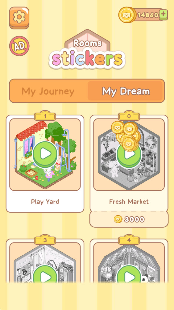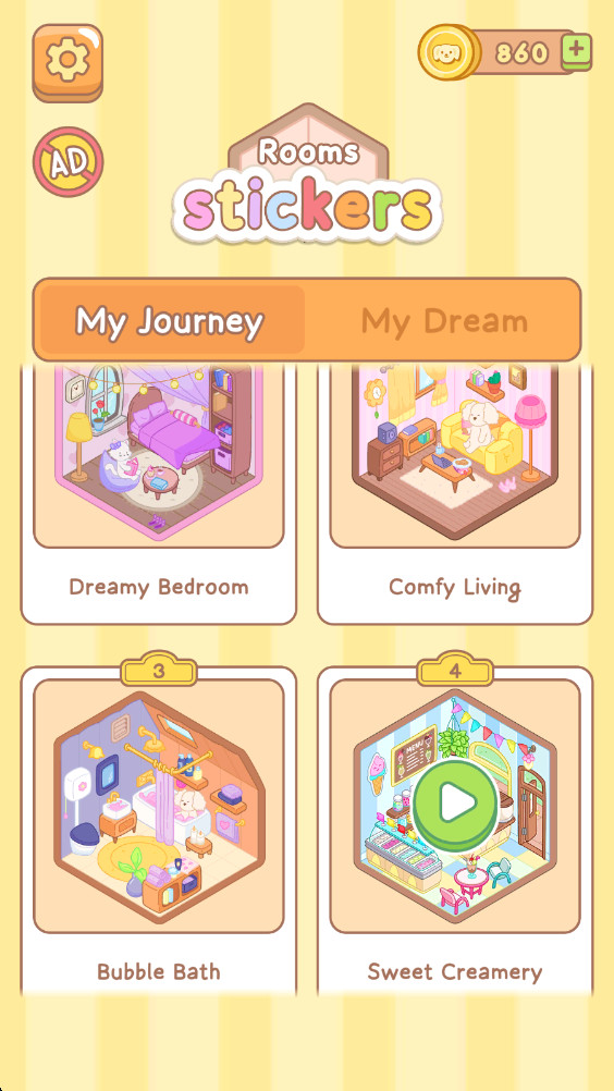 游戏操作简单易上手,但充满挑战性。首先选择你感兴趣的关卡进入游戏场景,每个场景都会呈现出不同风格的房间布局和特定的装饰需求。仔细观察房间的光影效果和环境提示,这将帮助你选择合适的贴纸进行搭配。