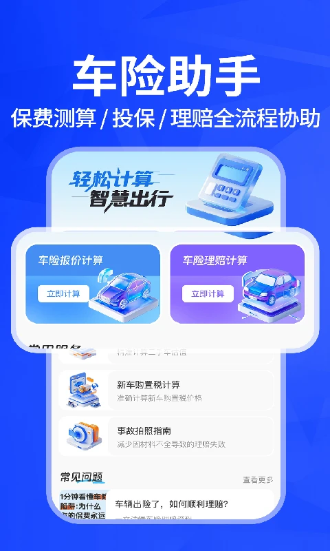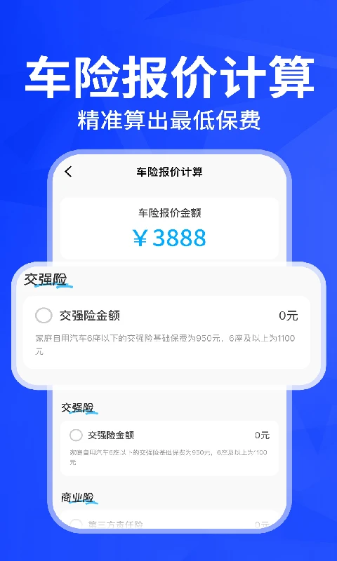 车险报价实时查询,为各位车主贴心准备的实用工具。核心功能亮点:智能车险计算器•实时生成车险报价+理赔预估值,1分钟看清保费陷阱(附专业避坑指南)•内置新车购置税/二手车折扣计算器,买车换车透明消费精准油费预测引擎•自定义油价、油耗、里程→自动输出油费/单公里成本热门品牌车价数据库热门品牌车价查询,查询市场价不吃亏