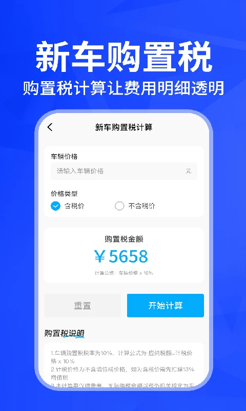 新车购置税计算:自动计算不同排量车型的购置税金额,购车预算一目了然