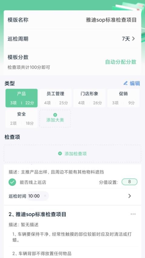 根据自己的巡检需求,可通过分类进行不同场景的巡检工作,系统预设多种常见场景模板,也支持自定义设置,满足各类商业场所的特殊检查需求。