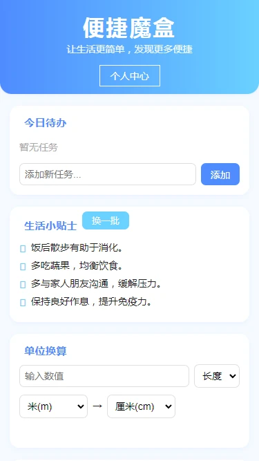 便捷魔盒是一款专为现代人设计的全能生活助手应用,致力于帮助用户高效管理日常生活的方方面面。它将任务管理、实用工具和健康服务三大核心功能融为一体,通过智能化的设计让繁杂的生活琐事变得井然有序。无论是工作任务的追踪、生活难题的解决,还是健康习惯的培养,便捷魔盒都能提供贴心的帮助。其简洁直观的界面设计和强大的功能组合,让每一位用户都能轻松上手,享受科技带来的便利生活体验。