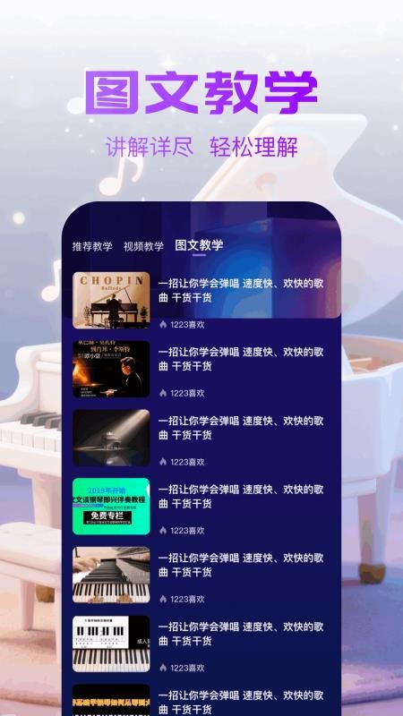 平台提供系统化的图文教学内容,从最基础的乐理知识到进阶演奏技巧,每个知识点都配有详细的图解说明。这些教学内容由专业钢琴教师精心编写,采用循序渐进的教学方式,让用户能够轻松理解并掌握钢琴演奏的要领。
