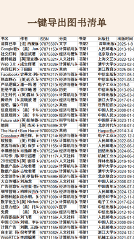 一键导出功能支持多种文件格式,用户可以将图书清单导出为Excel、PDF等格式,方便备份或与他人分享,数据迁移更加便捷。