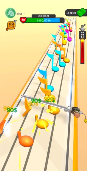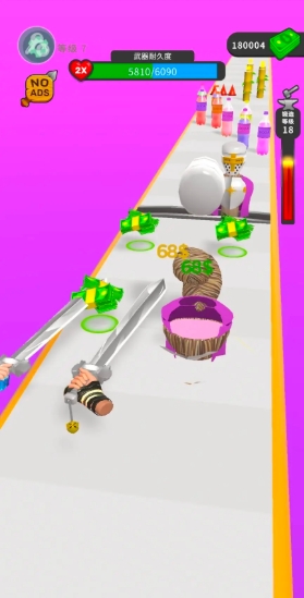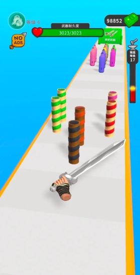 在游戏中,玩家需要通过滑动屏幕控制武器在跑道上移动,切割沿途出现的各种障碍物。切割过程会消耗武器耐久度,需要巧妙规划切割路线以最大化收益。跑道上的障碍物材质各异,玩家需要根据武器特性选择最佳切割策略,同时注意避开可能损坏武器的特殊障碍。