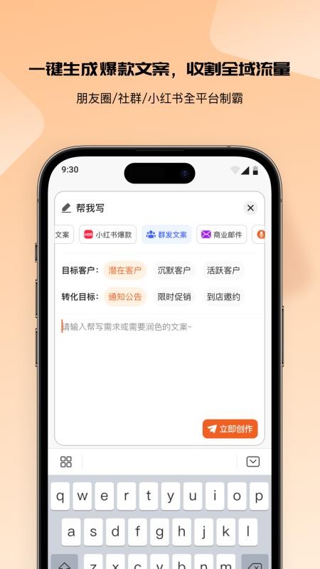 支持一键生成营销文案和销售话术,AI会根据产品特点和目标客户自动创作优质内容。生成的文案可直接用于朋友圈、社群等营销场景,节省创作时间。用户可对生成内容进行二次编辑,确保符合个人风格和业务需求。