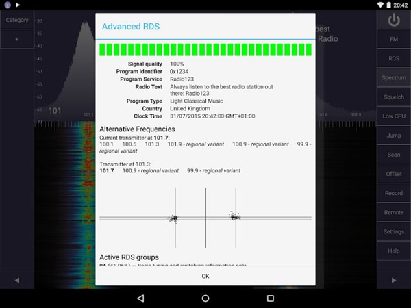 频谱功能:在频谱试用期结束后,您可以通过打开SDRTouchKey软件来继续使用频谱分析功能。该功能解锁后,您将能够同时使用高级RDS监视器和录音功能,为您的无线电探索提供更多专业工具。