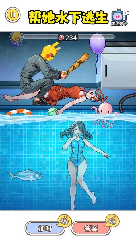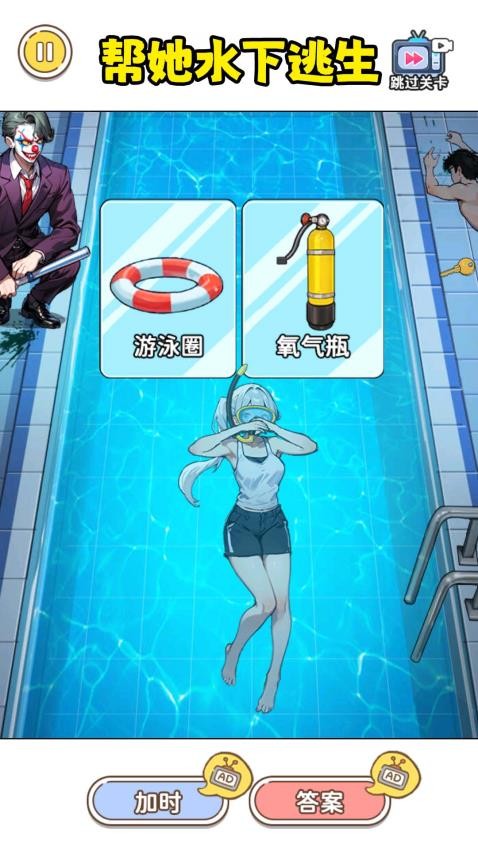 《帮女孩摆脱危机》以微恐氛围为基调,讲述了一个扣人心弦的逃生故事。女孩在游泳池意外目睹蒙面男行凶,为了躲避追杀,她被迫潜入水中隐藏,但氧气正在快速耗尽!玩家必须迅速行动,利用场景中的各种道具为她制造呼吸机会——可能是隐藏的呼吸管、能够分散凶手注意力的物品,或是巧妙的水下掩护。每一步选择都关乎生死,你需要保持冷静与机智,帮助女孩躲过致命危机,逃离这场水下噩梦!游戏不仅考验玩家的反应速度,更注重策略与观察力,让每个决定都充满意义。