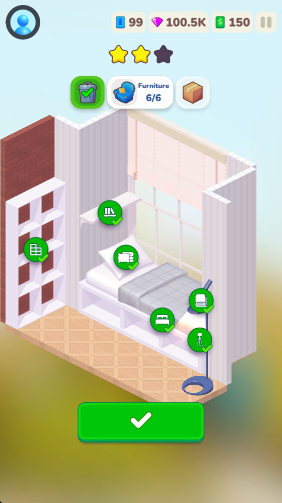 当你完成当前房间的所有布置工作后,系统会自动评估你的设计成果。如果达到要求,就可以解锁下一关卡,挑战更复杂的设计任务。随着游戏进程的推进,你将接触到更多元化的设计项目,从简单的家居改造逐步扩展到大型商业空间的设计,最终实现对整个城市的规划与建设。