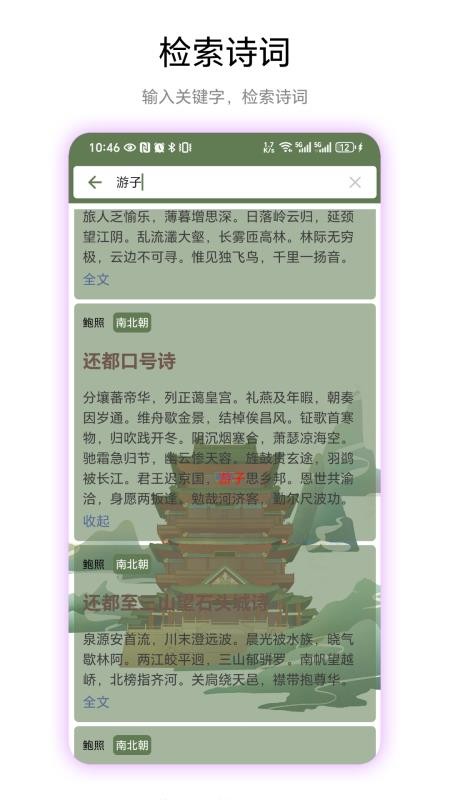 强大的搜索引擎支持按字、按句检索,快速定位到目标内容。搜索结果会高亮显示关键词,方便用户快速找到所需信息。这个功能特别适合在大量诗词中寻找特定句子或典故。