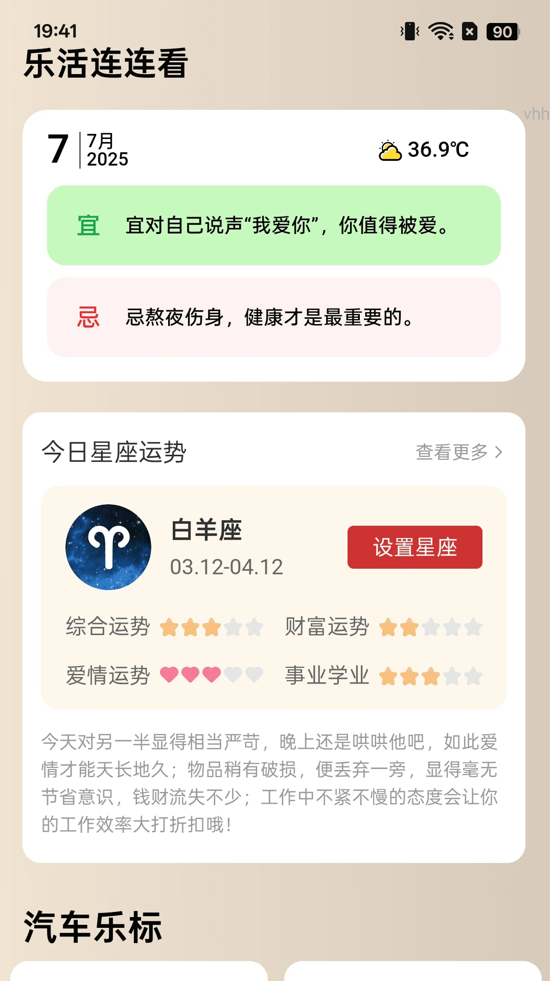 在「充电乐生活」,爱车充电的每一刻都能变得轻松惬意!平台整合优质充电桩资源,打造专属"生活乐充电桩"。贴心的"充电记录本"自动存档每次充电时间、电量、费用,可视化车辆历程与维护信息——让爱车养护一目了然,省心又省力。想让出行更有乐趣?每日"运势出行"专区为你送上星座运势指引,金牛座今日宜短途自驾,双鱼座适合结伴出行,搭配专属"汽车乐标"让爱车颜值与运势双在线。从充电便捷到爱车养护,从运势参考到个性表达,「充电乐生活」让每一次爱车充电都成为生活小确幸的起点,开启轻松自在的有车生活!
