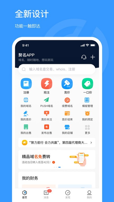 聚名app最新版是一款专业的域名综合管理软件,为用户提供全方位的域名服务解决方案。作为国内领先的域名服务平台,它不仅支持基础的域名查询和注册功能,还能让用户轻松管理多个域名,进行分组收藏,并参与域名竞价和交易。无论是个人用户还是企业客户,都能在这里找到适合自己的域名服务,满足不同场景下的需求。