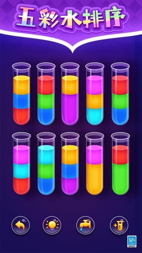 游戏的核心玩法是将同色液体归入同一试管中。玩家需要仔细观察各个试管中液体的分布情况,合理利用空试管进行中转,避免不同颜色液体混合造成失败。