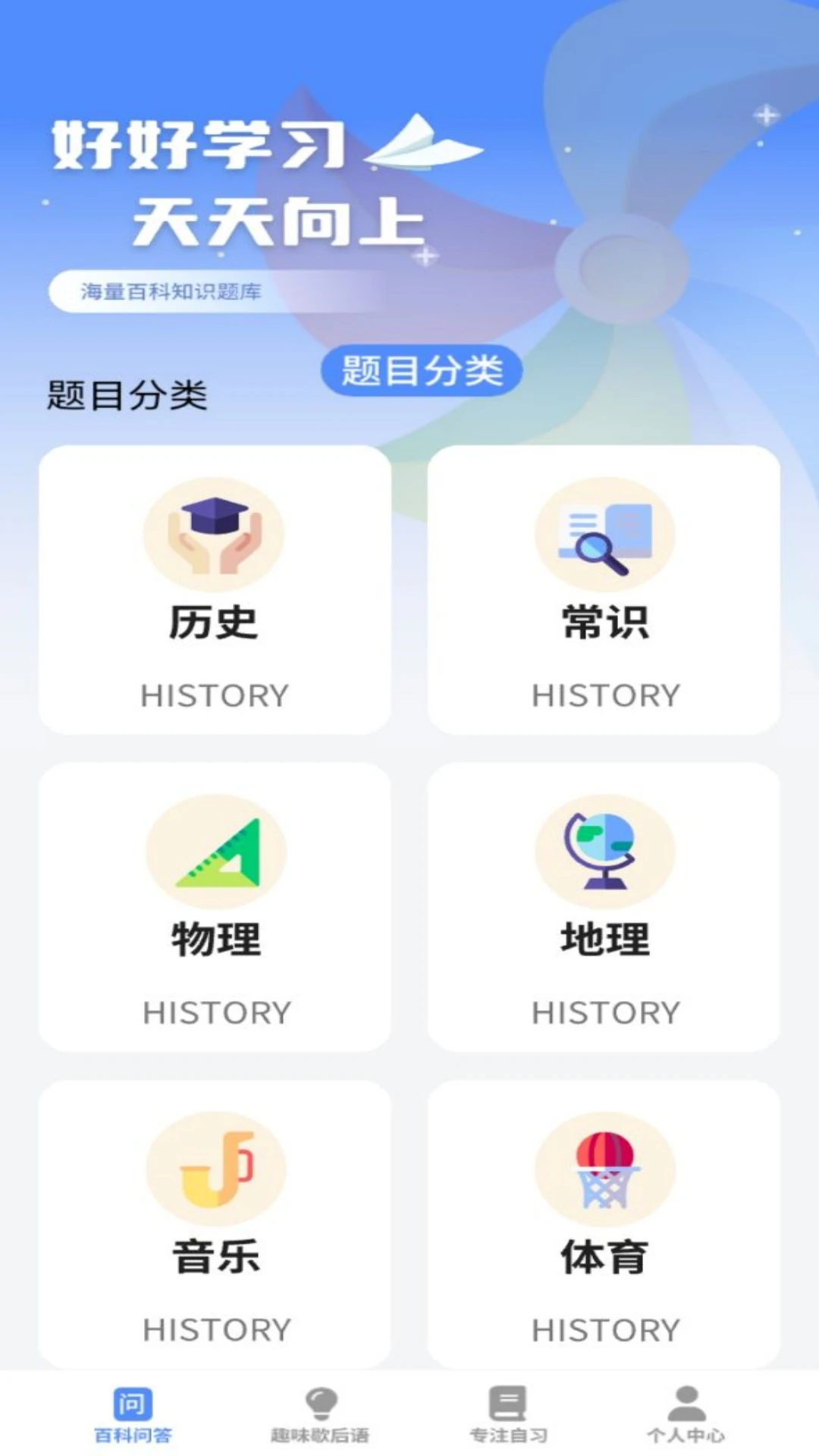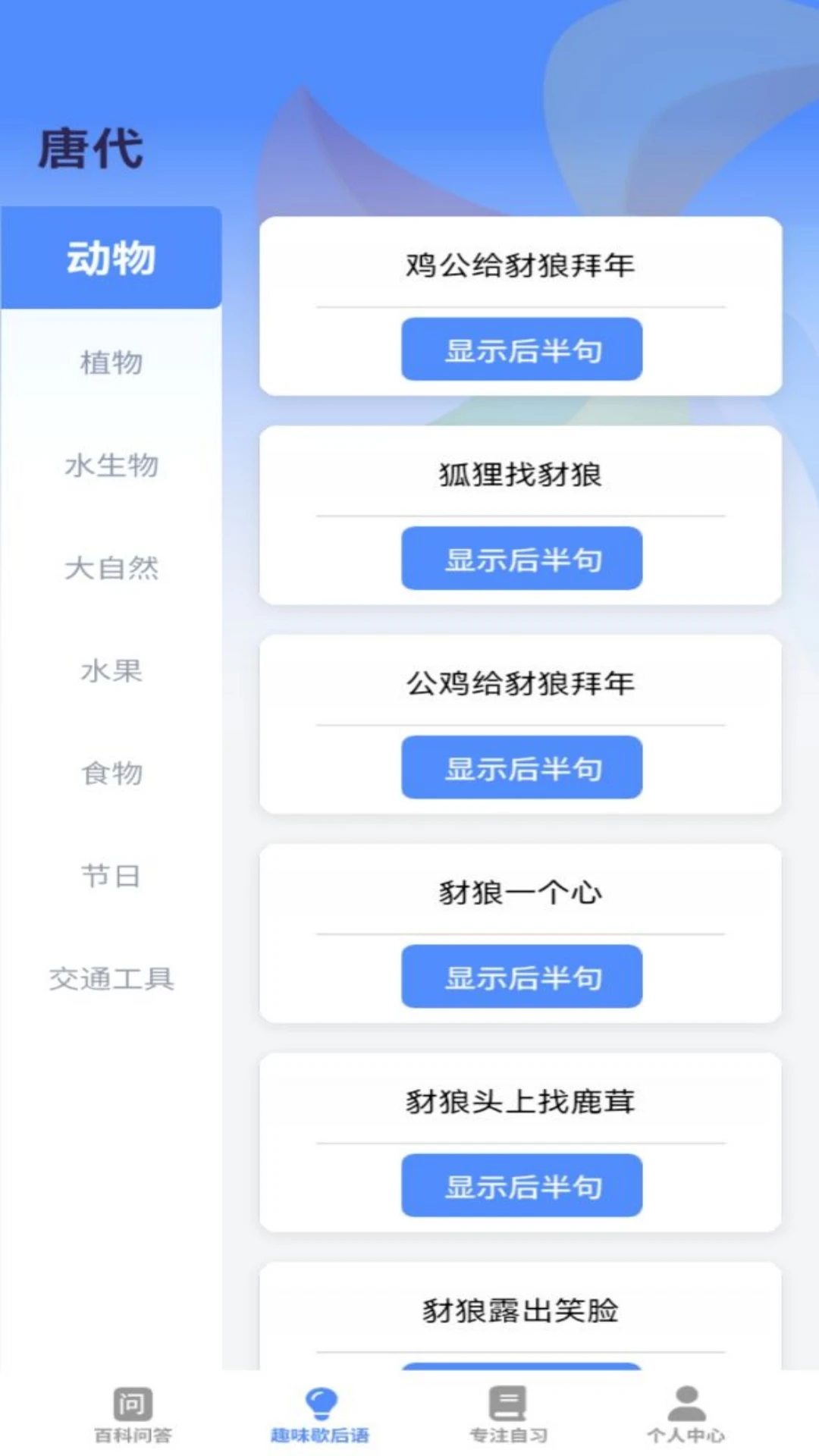 这款应用集答题式百科问答、趣味歇后语与专注自习三大功能模块于一身,为用户提供了一种全新的学习体验。在答题式百科问答模块,用户可以通过回答问题的形式深入了解百科知识,不仅能检验自己的知识储备,还能在回答过程中发现新的知识点,激发学习兴趣。趣味歇后语模块则为用户带来了轻松有趣的学习氛围,让您在欢笑中感受语言的魅力。而专注自习模块则为用户打造了一个安静、专注的学习环境,帮助用户高效地进行自我提升。无论您是寻求知识的探索者,还是希望在工作之余充实自己的学习者,这款应用都能满足您的需求,让您在轻松愉快的氛围中不断成长。功能介绍