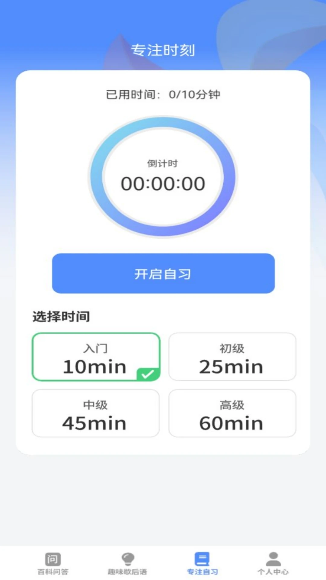 专注自习模块提供计时功能,帮助用户科学规划学习时间