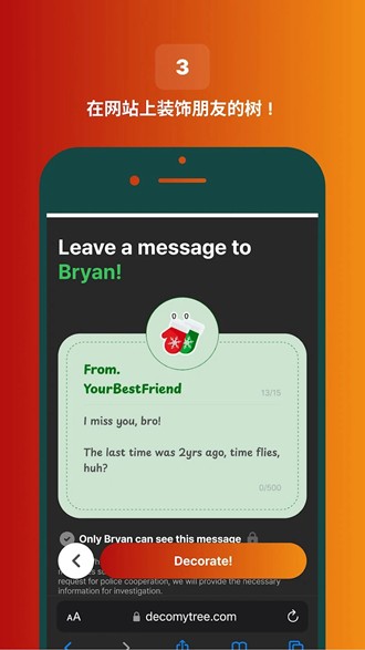 所有收集到的祝福信息都会妥善保存,直到圣诞节当天才能完整查看,为节日增添更多惊喜元素。愿DecoMyTree为你带来一个明亮而欢乐的圣诞节!