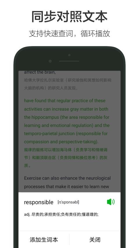 实现音频与文本的精准同步,支持逐句高亮显示,帮助用户建立声音与文字的对应关系。